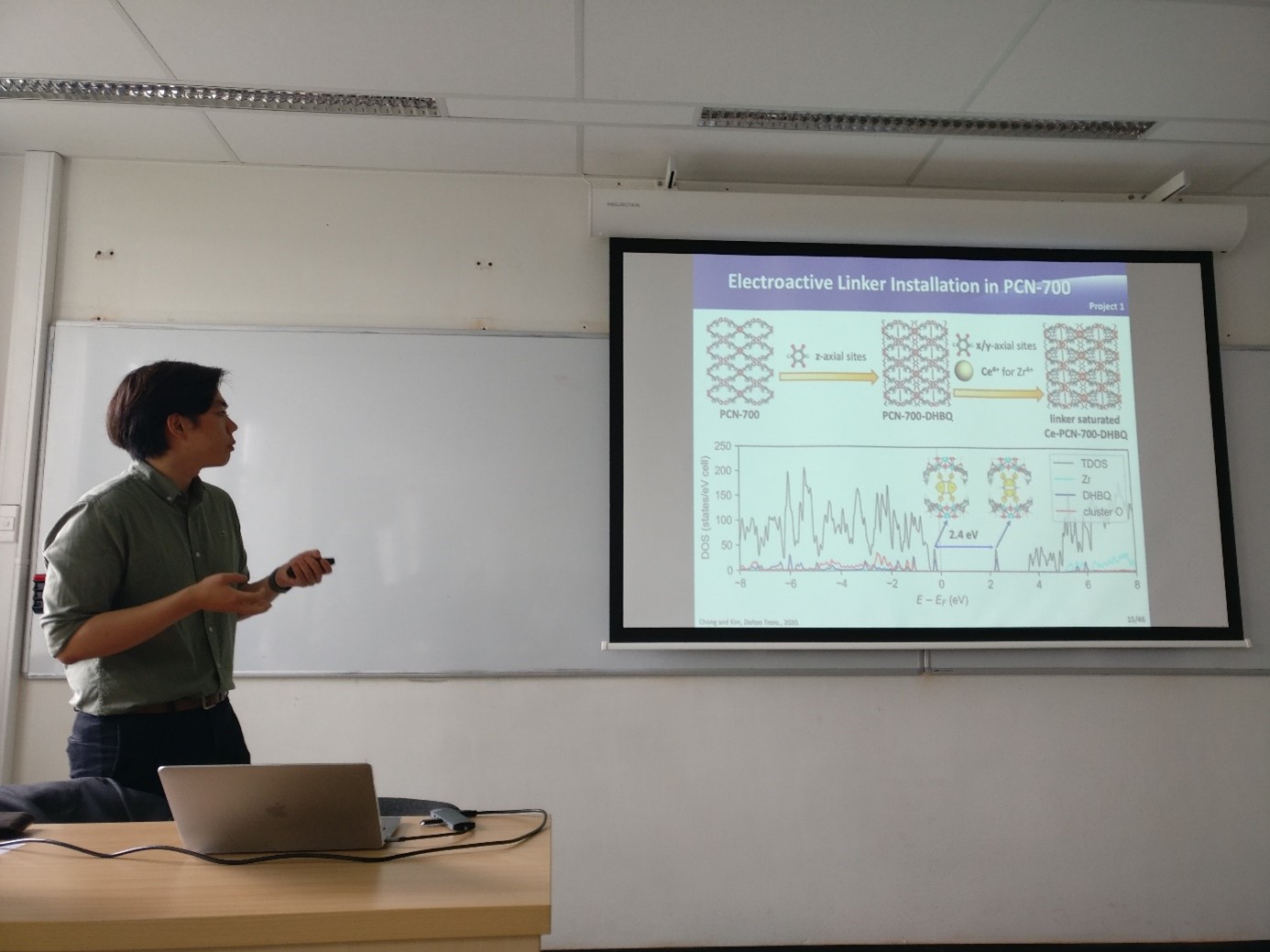 During his research visit to the CMM Sanggyu gave a talk about his research on the ‘Computational Design of Electrically Conductive Metal-Organic Frameworks by Exploring Strategies to Construct Charge Transport Pathways’. Metal–organic frameworks, or MOFs, which are widely recognized for their ultrahigh porosity and chemical tunability, have shown great promise in a variety of adsorption-based applications. More recently, it has been shown that electrical conductivity can be induced in MOFs, which has led to their successful utilization in electronic or electrochemical applications. One could expect that chemical tunability and high porosity of MOFs would allow these materials to achieve outstanding and unprecedented performances in these new application fields. Nonetheless, progress is stunted by the limited number of electrically conductive MOFs discovered to date, and hence continued discovery of new and improved electrically conductive MOFs is crucial. In his talk, Sanggyu discussed the computational design approaches for the discovery of new electrically conductive MOFs by constructing long-range charge transport (CT) pathways in the materials. More specifically, he presented on the following: (1) rational modifications of previously insulating MOFs to newly induce electrical conductivity, (2) installation of electroactive moieties in MOFs with significant framework flexibility, (3) topologically guided construction of 3D π-d conjugated MOFs, and (4) development of a deep learning model to predict the electronic structures of MOFs. We are eager to witness how the design approaches and computational methods proposed and developed by Sanggyu will significantly expedite the discovery of new electrically conductive MOFs!