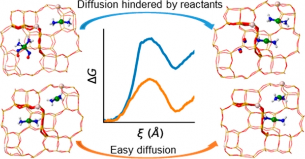 The stability and mobility of a set of organic structure-directing agents (OSDAs) with different molecular geometries and chargedistribution confined within the pear-like cavities of neutral and Al-containingmodels of AEI zeolites have been investigated by using static densityfunctional theory calculations and ab initio molecular dynamics simulations.The objective is to identify the role of electrostatic interactions between theOSDAs’ positive charge at N+ atoms and the anionic framework AlO4−centers on the preferential stabilization of Al at specific crystallographicpositions, opening the possibility to modulate the Al distribution in AEIzeolites. We find that several classical piperidinium-based OSDAs withdiverse methyl-substituent patterns in the N-containing ring but asymmetrical charge distribution, as well as bulkier nonclassical azoniabicycle-heptane-based OSDAs with the positive chargeasymmetrically located at one side of the molecule, behave similarly. All of them remain almost immobile at the center of the aeicavity along the simulations and always stabilize Al preferentially at the T1 crystallographic position. In contrast, an azabicyclo-octane-based OSDA with the positive charge located outside a cyclo-octane ring lacking substituents exhibits an enhanced mobilitythat includes full rotation within the aei cage and the ability to reach the regions of the cavity not accessible to the other OSDAsinvestigated. As a result, this highly mobile OSDA preferentially stabilizes Al in the T3 site, which might lead to differences incatalyst activity and stability for zeolite samples synthesized using this OSDA.