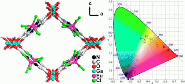 A gallium 2,2′-bipyridine-5,5′-dicarboxylate metal-organic framework, Ga(OH)(bpydc), denoted as COMOC-4 (COMOC = Center for Ordered Materials, Organometallics and Catalysis, Ghent University) has been synthesized via solvothermal synthesis procedure. The structure has the topology of an aluminum 2,2′-bipyridine-5,5′-dicarboxylate, the so-called MOF-253. TEM and SEM micrographs show the COMOC-4 crystals are formed in nanoplates with uniform size of 30-50 nm. The UV-Vis spectra of COMOC-4 in methanol solution show maximal electronic absorption at 307 nm. This results from linker to linker transitions as elucidated by time-dependent density functional theory simulations on the linker and COMOC-4 cluster models. When excited at 400 nm, COMOC-4 displays an emission band centered at 542 nm. Upon immersion in different solvents, the emission band for the framework is shifted in the range of 525~548 nm, depending on the solvent. After incorporating Eu3+ cations, the emission band of the framework is shifted to even shorter wavelengths (505 nm). By varying the excitation wavelengths from 250 to 400 nm, we can fine-tune the emission from red to yellowish green in the CIE diagram. The luminescence behavior of Eu3+ cations is well preserved and the solid state luminescence lifetimes of λ1 = 45 µs (35.4 %) and λ2 = 162 µs (64.6 %) are observed.
