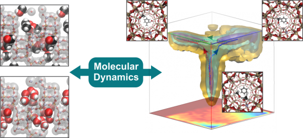 The methanol to olefins process is a show case example of complex zeolite-catalyzed chemistry. At real operating conditions, many factors such as framework flexibility, adsorption of various guest molecules and competitive reaction pathways, affect reactivity. In this paper we show the strength of first principle molecular dynamics techniques to capture this complexity by means of two case studies. Firstly, the adsorption behavior of methanol and water in H-SAPO-34 at 350 °C is investigated. Hereby we observed an important degree of framework flexibility and proton mobility. Secondly, we studied the methylation of benzene by methanol via a competitive direct and stepwise pathway in the AFI topology. Both case studies clearly show that a first principle molecular dynamics approach enables to obtain unprecedented insights into zeolite-catalyzed reactions at the nanometer scale.
