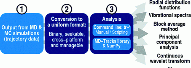 In this paper, we present MD-TRACKS, an advanced statistical analysis toolkit for Molecular Dynamics and Monte Carlo simulations. The program is compatible with different molecular simulation codes, and the analysis results can be loaded into spreadsheet software and plotting tools. The analysis is performed with commands that operate on a binary trajectory database. These commands process not only plain trajectory data but also the output of other MD-TRACKS commands, which enables complex analysis work flows that are easily programmed in shell scripts. The applicability, capabilities, and ease of use of MD-TRACKS are illustrated by means of examples, that is, the construction of vibrational spectra and radial distribution functions from a molecular dynamics run is discussed in the case of tetrahydrofuran. These properties are compared with the experimental data available in the literature. MD-TRACKS is open-source software distributed at http://molmod.ugent.be/code/.