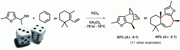 Furfuryl alcohols are revealed as direct reaction partners for a wide range of conjugated dienes in a (4+3) cycloaddition motif (see scheme). This novel Lewis-acid-promoted process gives straightforward access to various polycyclic skeletons containing a seven-membered ring. A plausible cationic stepwise mechanism was confirmed by DFT calculations.