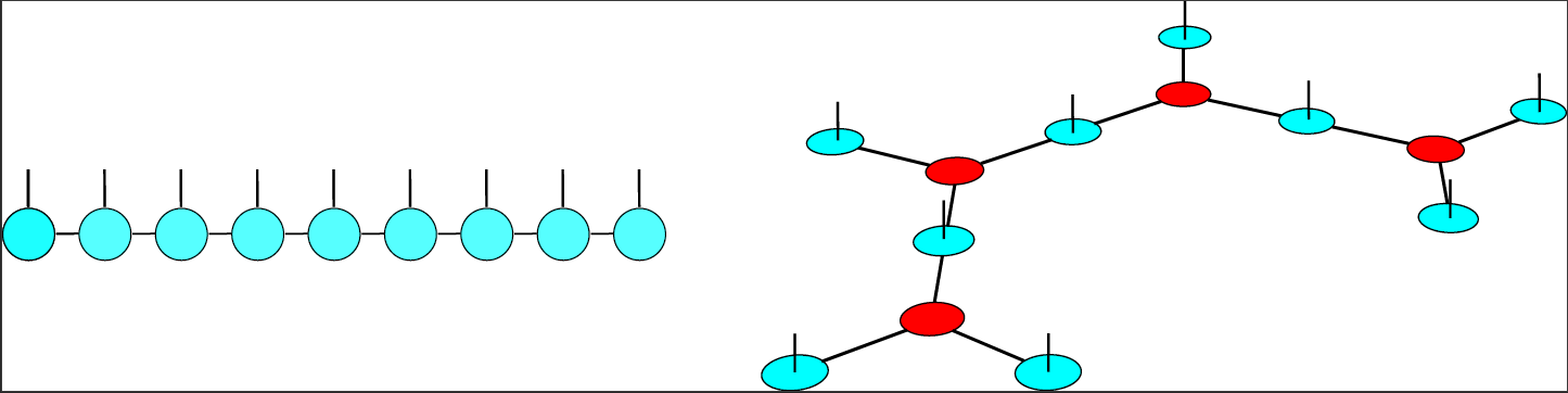 Fig 1. left: an example of the MPS, a linear tensor network. Right: an example of the T3NS ansatz, blue circles are physical tensors, red circles are branching tensors.Goal