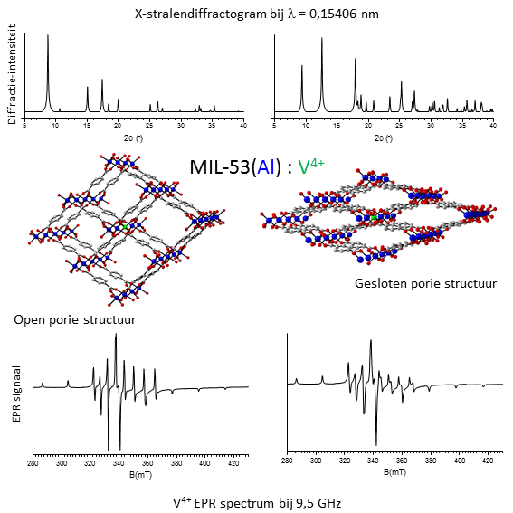X-ray diffraction is the standard technique to determine the crystal structure, hence this method can be used to detect breathing transitions. However, such transitions also result in small changes in the lattice vibrations and electronic structure of the paramagnetic ions (eg. V4+). These changes can be traced in situ with far-infrared (Far-IR) spectroscopy and electron paramagnetic resonance spectroscopy (EPR). Recently, the application of EPR gave rise to unexpected results that are not yet fully understood, while the application of Far-IR on MOF structures is unique thus far.