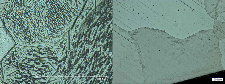 Figure 1: Left: Nitrogen is precipitated out of the Fe matrix in the form of Fe¬4N (slower cooling rate). Right: Nitrogen is in solid solution in the Fe matrix (faster cooling rate).Goal