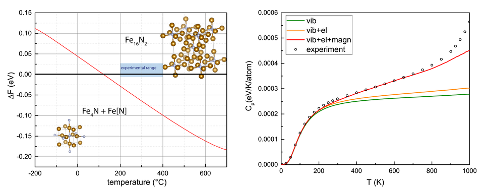 Calculations on the electronic level require a quantum mechanical treatment. Density-functional theory (DFT) enables us to model any Fe-N material without experimental input (ab initio). This yields the materials properties at zero kelvin. To extend these to finite temperatures, we use the quasiharmonic approach. Phonon spectra at different volumes are derived from DFT calculations, which accounts for thermal expansion, from which the vibrational contribution to the free energy can be derived. Because steels are magnetic materials, we need to take into account the magnetic entropy as well. This can also be done with DFT, by calculating the magnetic exchange interactions between atoms. All of these elements will add up to a fully ab-initio thermodynamic picture of compounds relevant for the iron-nitrogen steels. These can be used to obtain relative phase equilibria[Figure 2 (left)], a solvus, or simply the heat capacities [Figure 2 (right)].