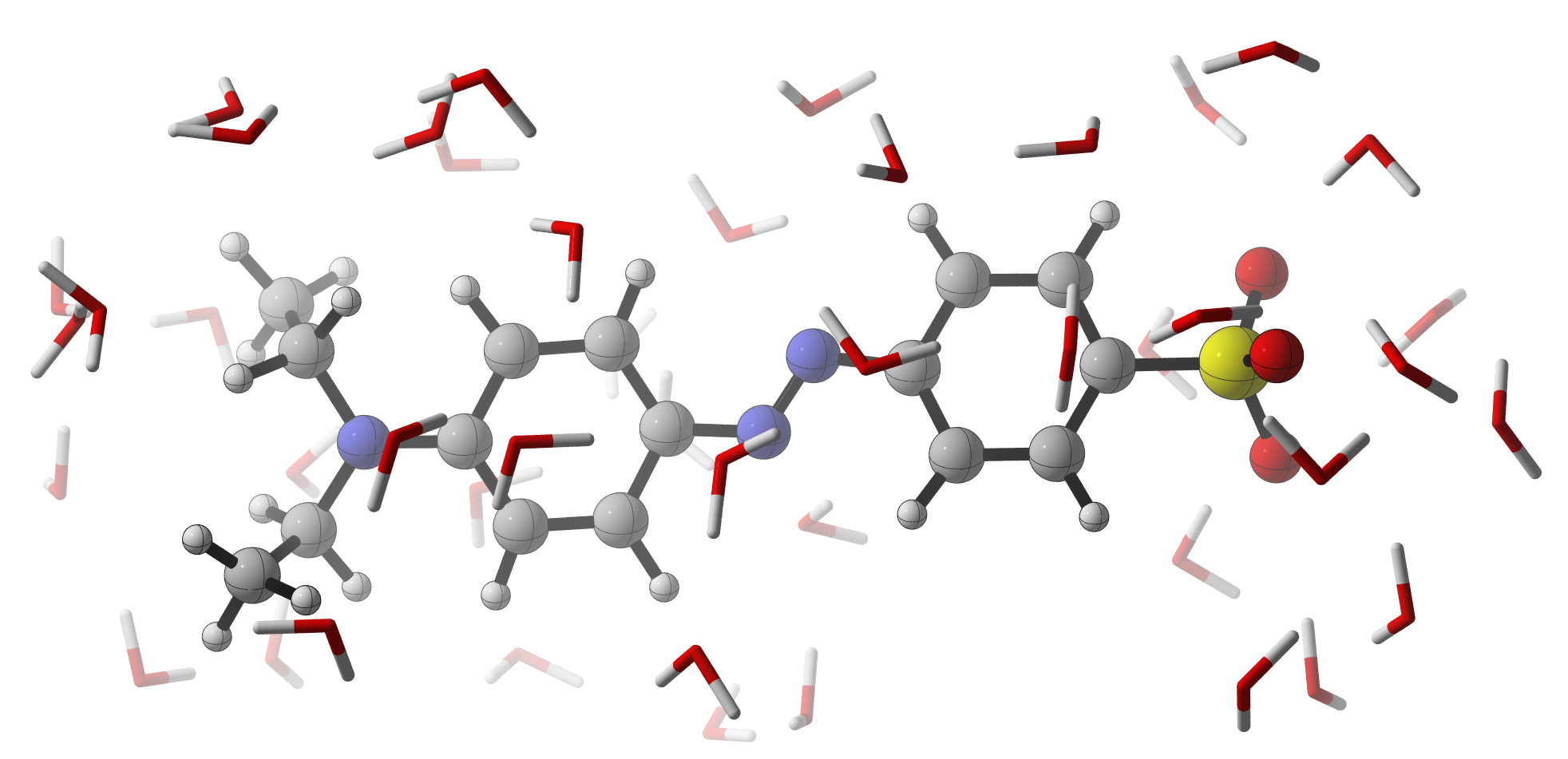 Fig. 1: Atomistic model of ethyl orange solvated in water.Once the QSAR model is validated, it will be used to design the pKa of pH-sensitive dyes by altering relevant functional groups. To obtain a useful color of the dye, i.e. in the visible part of the electromagnetic spectrum, the delocalized π-bond should remain extended over a large part of the molecule. Substituents on the aromatic system can be used to modulate the pKa. However, in order to embed the dyes into a polymer, additional substitutions are needed, which also have their impact on the pKa. All these effects have to be accounted for in the design of the dye.