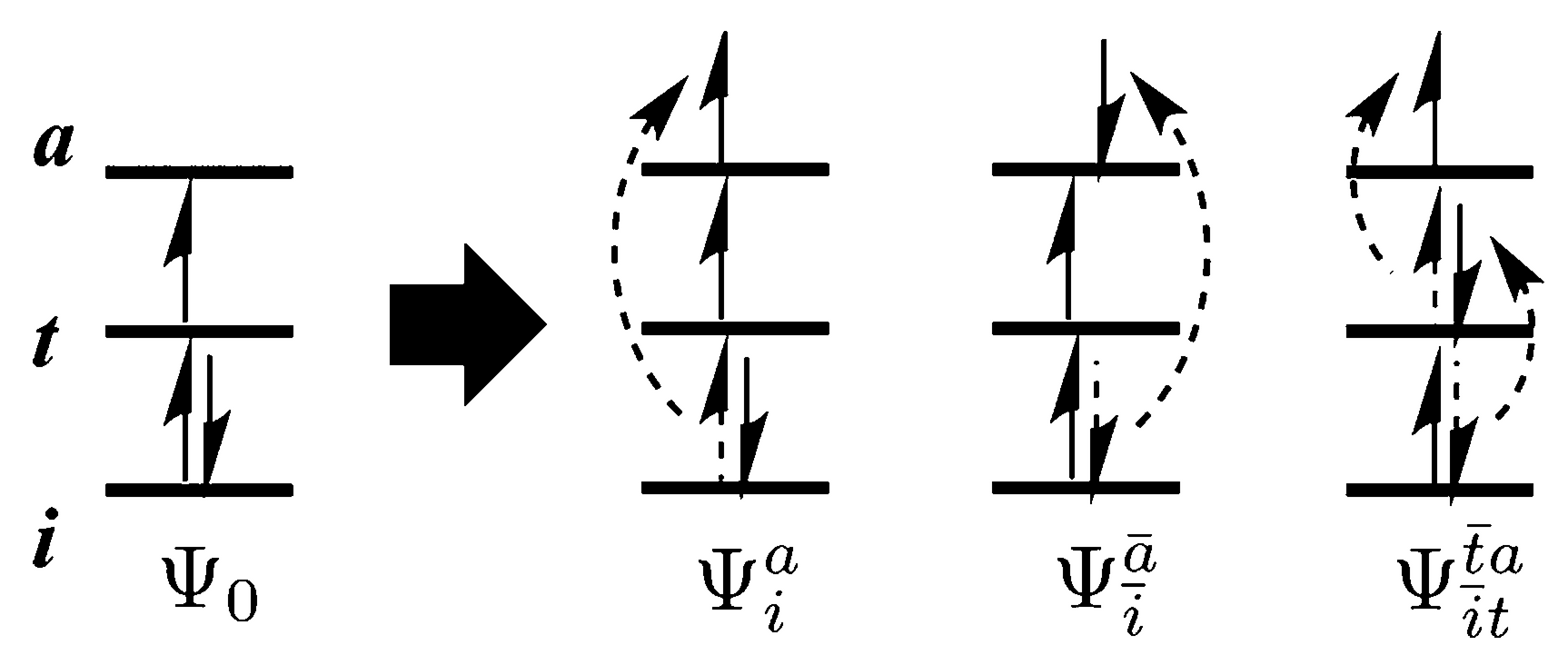 DFT as such is restricted to ground state properties, but a time-dependent (TD) variant was proposed some years ago to also predict excited states. Linear-response TDDFT has proven successful in reproducing both excitation energies and transition probabilities. Unfortunately, it is still inaccurate when describing open-shell systems. This is mainly because of the so-called adiabatic approximation. The adiabatic approximation assumes that a time-independent exchange-correlation functional can be used, but this reduces the predicted solutions to 1 particle – 1 hole (1p1h) excitations only. Double excitations are not included, which may nevertheless play an important role in open-shell materials. A prominent example is that of spin contamination: even for three electrons in a three-level system, it can already be seen that the construction of a pure doublet or quadruplet state (spin 1/2 or 3/2) often requires taking into account double excitations as well (see figure below). A TDDFT doublet or quadruplet target state is therefore usually mixed with other spin states.