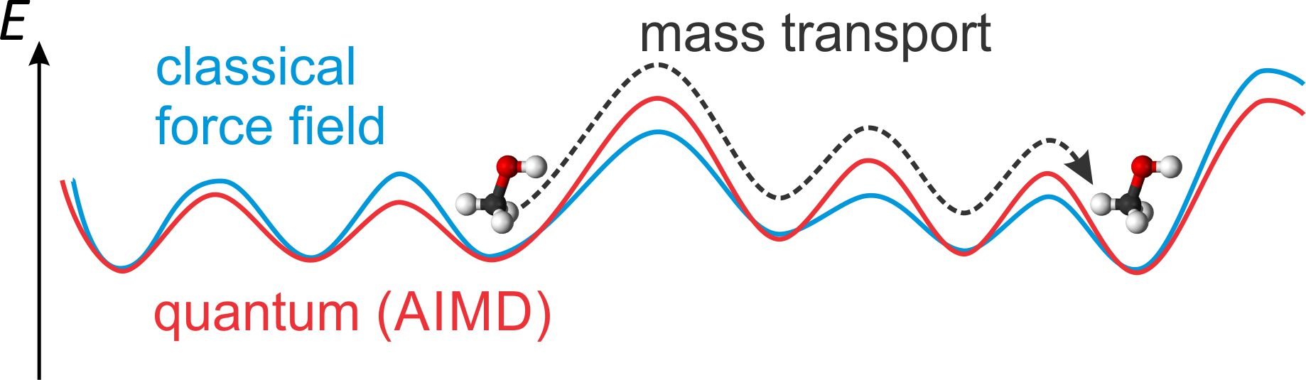 At the atomic scale, mass transport can be seen as the result of molecules hopping over a multitude of energy barriers on the energy landscape (Fig. 1). Hopping over such barriers are often rare events, forming the bottleneck in diffusion. Predicting the height of those many barriers correctly with simulations will lead to correct predictions of the longer time scale dynamics, i.e. the mass transport. Nowadays, quantum mechanical simulations, known as ab initio molecular dynamics (AIMD), are rarely used to study diffusion because of the high computational cost. Diffusion is usually modelled with so-called force fields that describe the atomic interactions with classical potentials. While these force fields are usually able to reproduce the equilibrium distribution of quantum mechanical structures (the bottom of the energy wells), their dynamical and transport properties can differ largely (dictated by the energy barriers). The predicted diffusivities may differ by one order of magnitude, e.g. when comparing several force fields for adsorbates diffusing through zeolites. There is thus a clear need to identify which force field is accurately describing the true dynamics.