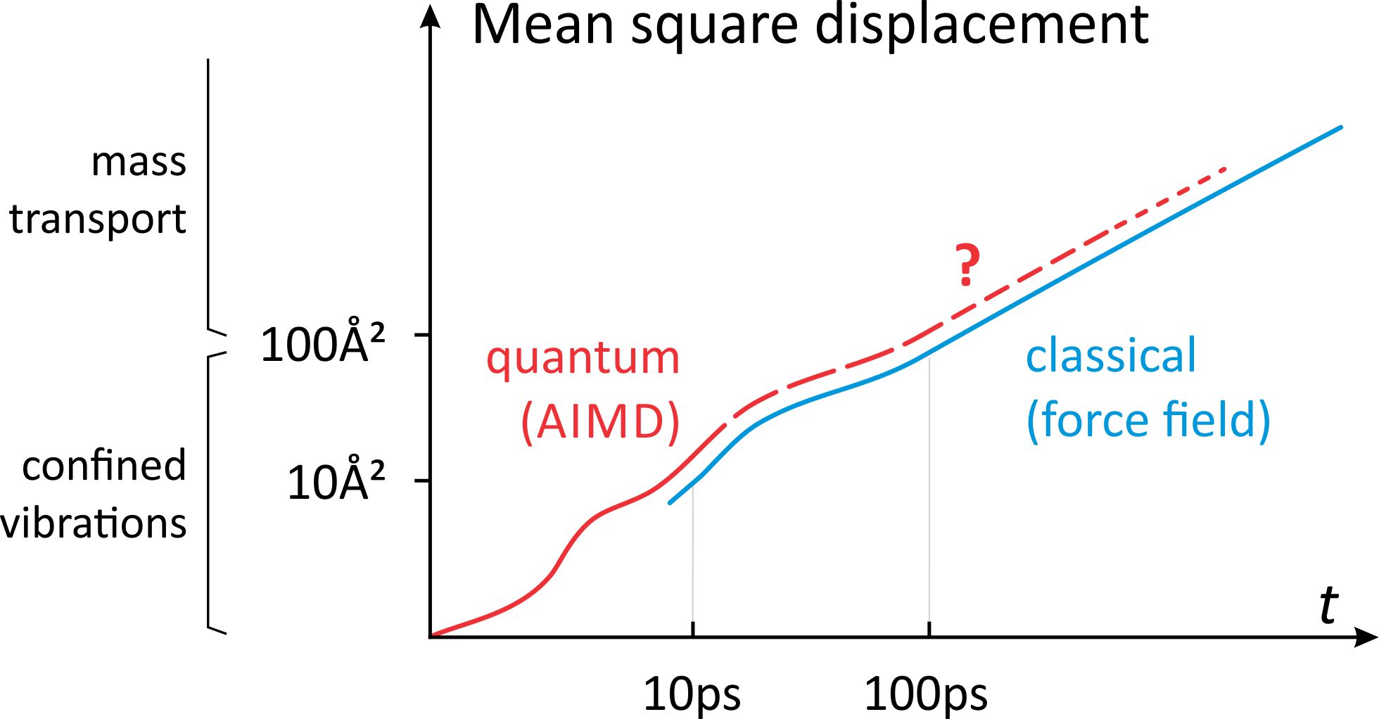 Fig. 2 - The time scale of quantum simulations is limited by the computational cost. This thesis will investigate how well the average distance traveled by a particle (cfr. mean square distance, scales linearly with time for a drunken-man’s walk) is reproduced by classical force fields.Goal
